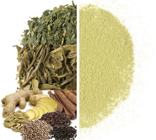 Green tea, Ginger, Cinnamon, Cardamom, Black + White pepper, Clove, Nutmeg.